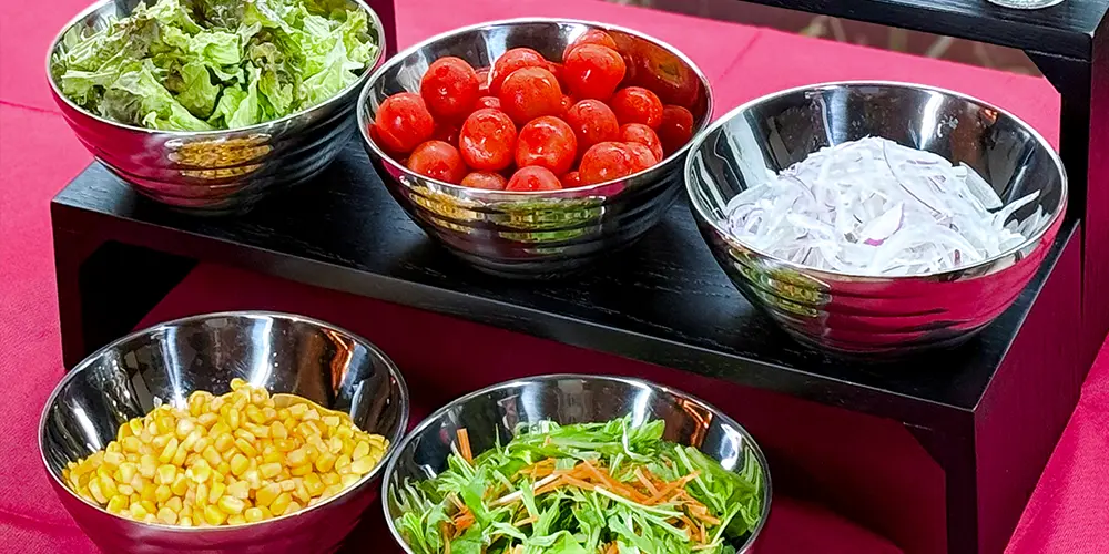 以当天的新鲜蔬菜为中心,准备了培根和炸洋葱等丰富多彩的配菜。请享受您喜欢的组合。