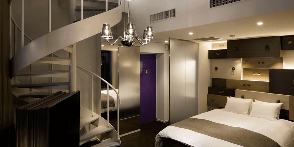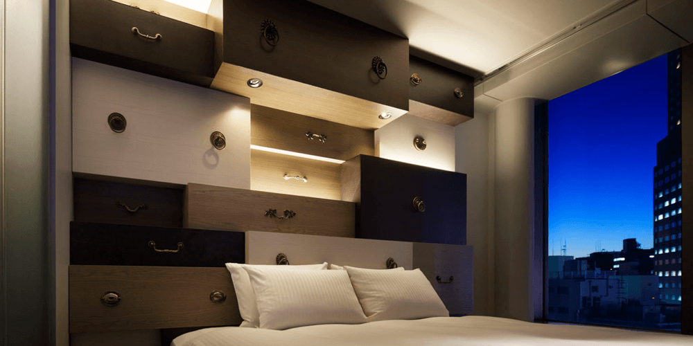 抽屉的房间。具有照明,架子,床等各种功能的抽屉布置在整个墙壁上。